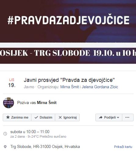 U subotu, 19. listopada u 10 sati dođite na Trg slobode (kod jedra) u Osijek na prosvjed „PRAVDA ZA DJEVOJČICE!“, u znak podrške svim žrtvama seksualnog nasilja koje od sustava ne dobivaju adekvatnu zaštitu. Povod prosvjeda je puštanje na slobodu petorice osumnjičenika za opetovano silovanje, seksualno iskorištavanje, ucjenjivanje te fizičko i psihičko maltretiranje petnaestogodišnje djevojčice koje je trajalo punih godinu dana. Puštanjem osumnjičenika za ove teške zločine na slobodu, pravosuđe ugrožava sigurnost, život i dostojanstvo žrtve.