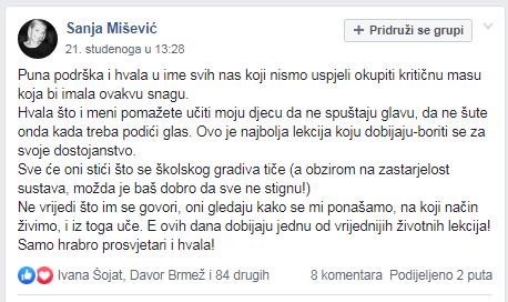 “Sve će oni stići što se školskog gradiva tiče (a obzirom na zastarjelost sustava, možda je baš dobro da sve ne stignu!) Ne vrijedi što im se govori, oni gledaju kako se mi ponašamo, na koji način živimo, i iz toga uče. E ovih dana dobivaju jednu od vrijednijih životnih lekcija! Samo hrabro prosvjetari i hvala”- zaključila je Mišević, a što je pobralo broje simpatije u grupi.