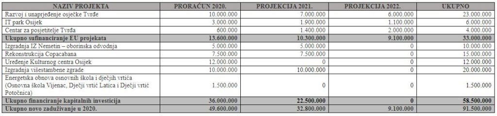 Sredstva kredita biti će utrošena za razvoj i unaprijeđenje Tvrđe, IT park, Cetar za posjetitelje Tvrđa, rekonstrukciju Kopike, uređenje Kulturnog centra Osijek, energentsku obnovu pojedinih škola i vrtića u Osijeku… Uostalom, pogledajte tablicu, ‘klikom’ na nju.