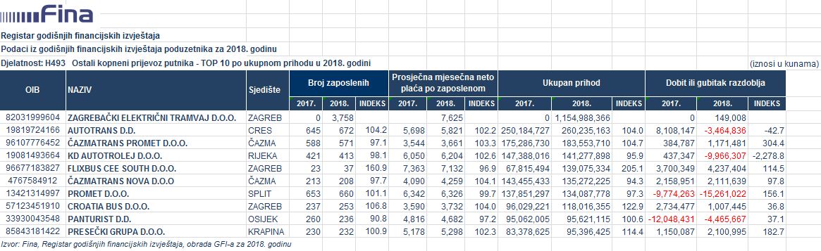 Najveći broj zaposlenih i najveći prihod u djelatnosti ostalog kopnenog prijevoza putnika u 2018. godini ostvario je ZAGREBAČKI ELEKTRIČNI TRAMVAJ d.o.o., a najveću dobit razdoblja društvo RIJEKA plus d.o.o. – piše i javlja Fina. Poduzetnici u djelatnosti kopnenog prijevoza i cjevovodnog transporta (NKD 49) u 2018. godini ostvarili su neto dobit u iznosu od gotovo 645,7 milijuna kuna (smanjenje od 22,5 %) i sudjelovali s 51,1 % u iskazanoj neto dobiti poduzetnika u području djelatnosti prijevoza i skladištenja – nastavlja Fina.