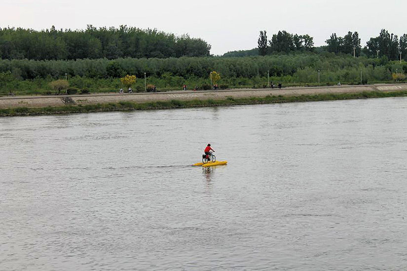 Riječ je o splavi koju pogoni ‘kapetan’ biciklom. I zacjelo je nešto najluđe što ćete ovog jutra vidjeti!