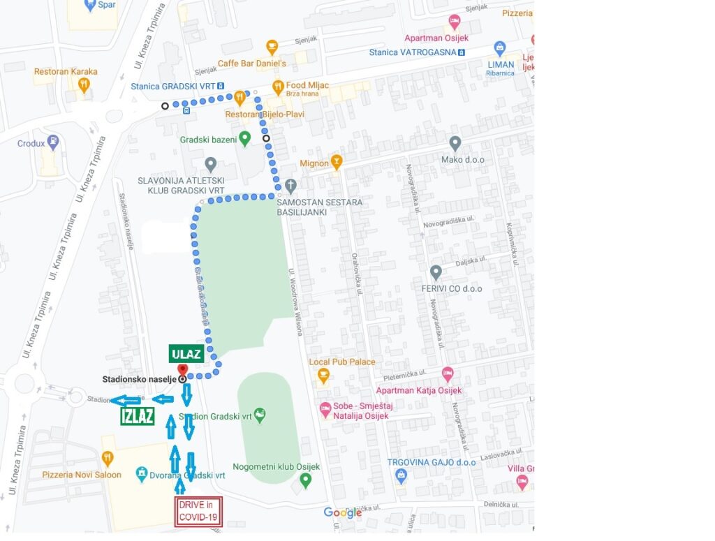 - Drive-in uzimanje uzoraka za PCR i antigensko testiranje bit će na platou dvorane Gradski vrt. Ulaz automobilima je iz Wilsonove ulice kod Gradskih bazena, pa bivšom spidvej stazom do istočnog ulaza br.1. (između stadiona i dvorane), o čemu će biti postavljeni putokazi, a bit će tu i dva redara. Radno vrijeme za drive-in testiranja je od 8.00 do 11.00 sati, a prikupljeni uzorci upućivat će se na obradu u KBC Osijek i Zavod za javno zdravstvo OBŽ. Plan je u početku prikupiti do 100 uzoraka, no moguće je povećanje kapaciteta – kazao je Lukić te dodao kako je i za drive-in testiranje potrebna prethodna najava na telefonske brojeve KBC-a i Zavoda za javno zdravstvo OBŽ.
