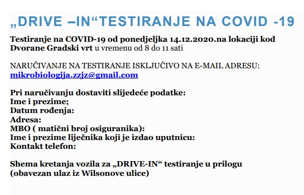 Od ponedjeljka, 14. prosinca, i u Osijeku počinje ‘drive-in’ uzimanje uzoraka za testiranje na koronavirus, javio je danas na konferenciji za novinstvo županijskog Stožera CZ ravnatelj Doma zdravlja Osječko-baranjske županije Mato Lukić. Ovdje donosimo nama dostupne informacije o ‘drive-in’ uzimanju uzoraka, a koje je prenio Stožer, za one osobe koje će biti u potrebi realizirati isto…