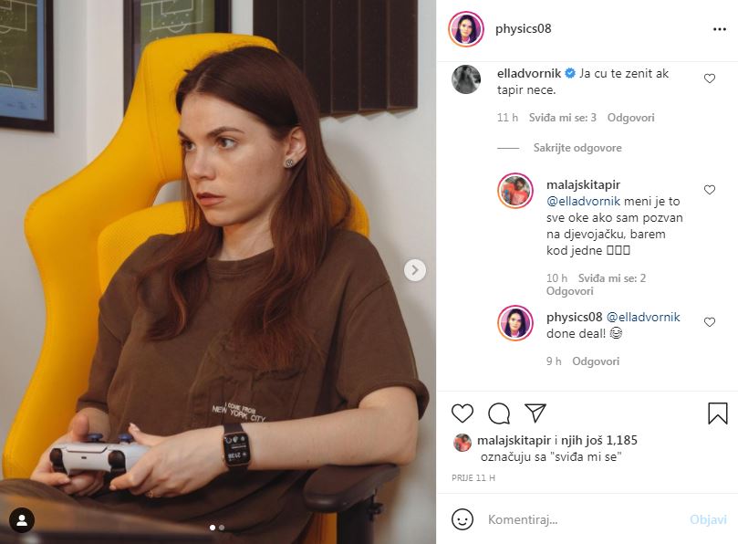 – Ja ću te ženit’ ak’ Tapir neće – napisala je Ella Dvornik, najpoznatija hrvatska influencerica, ispod Mateine objave na Instagramu, a kako uživa u video igrama na ‘Plejki’., što je, da se razumijemo, vrlo važna kvaliteta u žena kod muškaraca…
