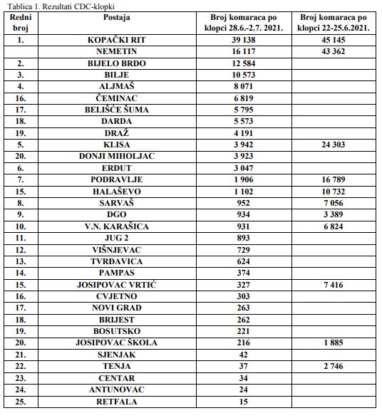 CDC-klopke postavljene su u večernjim satima te su pokupljene idući dan u jutro. Uzorkovanjem metodom CDC-klopki uz suhi led kao atraktant obuhvaćena su područja Kopačkog rita, Osijeka, Antunovca, Bilja, Čeminca, Belišća, Darde, Draža, Kneževih Vinograda, Valpova, Belišća, Jagodnjaka, Petlovca, Belog Manastira. Rezultati monitoringa prikazani su u Tabllici 1.