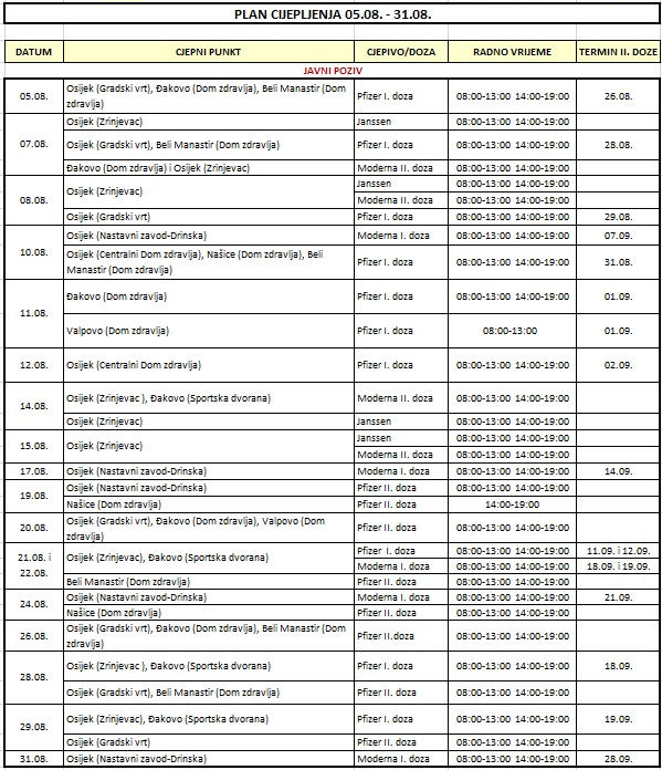 Na cijepljenje je potrebno ponijeti osobnu iskaznicu, zdravstvenu iskaznicu te putovnicu ukoliko je osoba strani državljanin. U nastavku je raspored cijepljenja I. i II. dozama prema cjepnim punktovima za razdoblje 05.08. – 31.08. – zaključuje se uz tablicu…