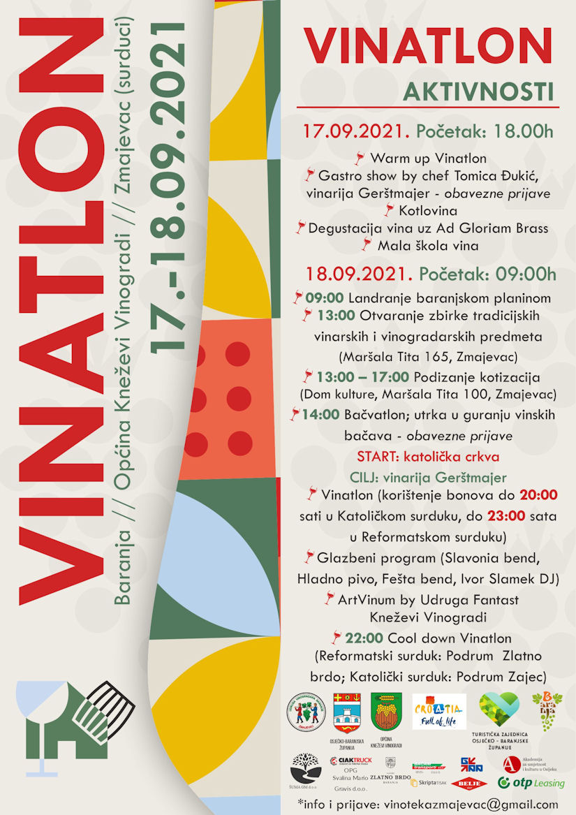 Treći vikend u rujnu vinska prijestolnica Baranje postat će poprište Vinatlona – nove i originalne manifestacije koja slavi vino i užitak življenja. U sklopu Vinatlona kao „krovne manifestacije“ održat će se i niz popratnih programa na više lokacija u Zmajevcu.