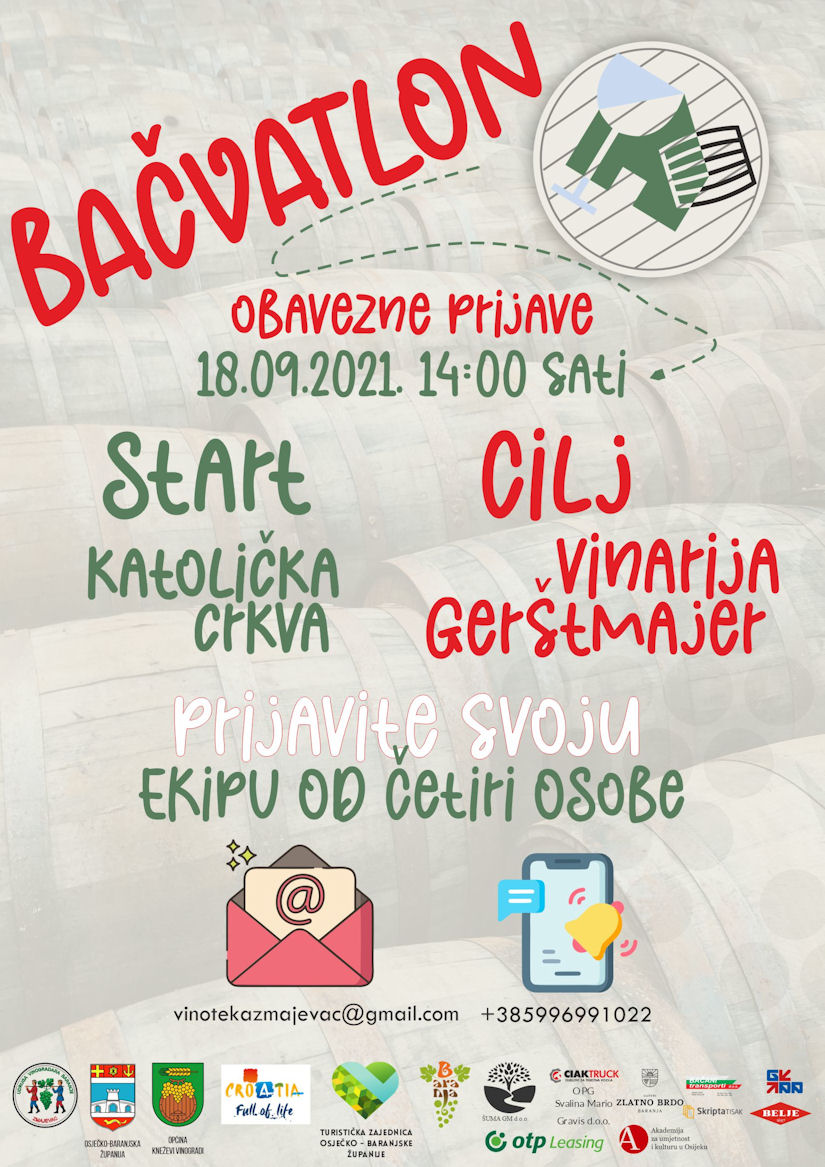 – Ipak, za one s izraženijim natjecateljskim duhom, tu je Bačvatlon – utrka u guranju vinskih bačvi, a start je kod katoličke crkve na početku katoličkog surduka. Na Bačvatlonu može sudjelovati maksimalno deset ekipa s po četiri člana. Nagrada za najbolje plasiranu ekipu je pozamašna – voucher za konzumaciju 5 litara vina u svakoj od vinarija sudionica Vinatlona koji se može iskoristiti u roku od godine dana – pojasnila je Gabriela Gerštmajer u ime organizatora.