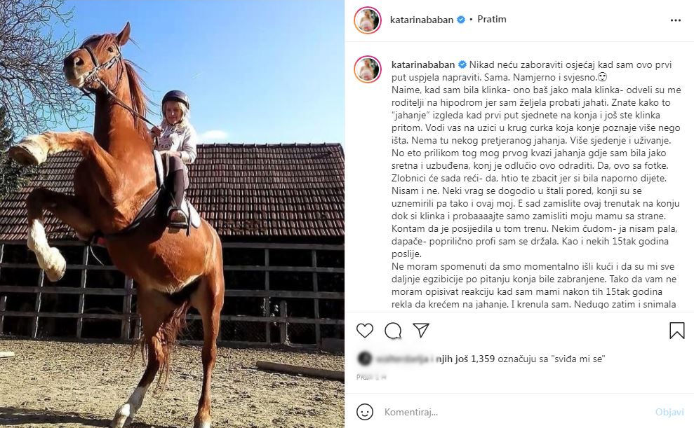 – Naime, kad sam bila klinka, ono baš jako mala ‘klinka’, odveli su me roditelji na hipodrom, jer sam željela probati jahati. Znate kako to “jahanje” izgleda kad prvi put sjednete na konja i još ste ‘klinka’, pritom. Vodi vas na uzici u krug ‘curka’ koja konje poznaje više nego išta. Nema tu nekog pretjeranog jahanja. Više sjedenje i uživanje. No eto, prilikom tog mog prvog kvazi jahanja, gdje sam bila jako sretna i uzbuđena, konj je odlučio ovo odraditi. Da, ovo sa fotke. Zlobnici će sada reći da – htio te zbacit’ jer si bila naporno dijete. Nisam i ne. Neki vrag se dogodio u štali pored, konji su se uznemirili pa tako i ovaj moj. E sad zamislite ovaj trenutak na konju dok si ‘klinka’ i probaaaajte samo zamisliti moju mamu sa strane. ‘Kontam’ da je posijedila u tom trenu. Nekim čudom ja nisam pala, dapače, poprilično ‘profi’ sam se držala. Kao i nekih 15-tak godina poslije – pisala je Katarina Baban.