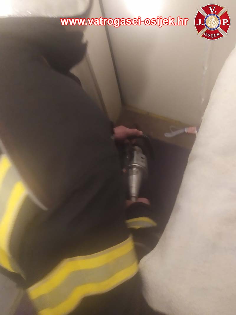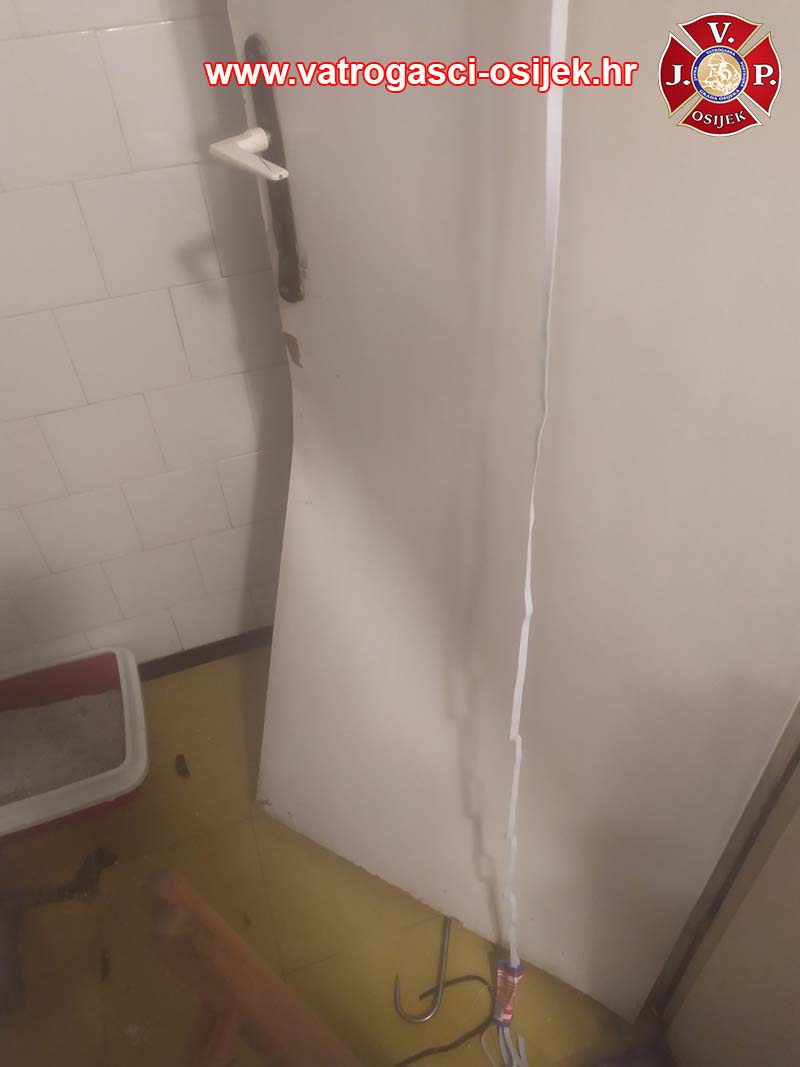 Dolaskom na mjesto intervencije vatrogasci su shvatili kako je na vrata od kupatila palo drveno sušilo te se vrata kupatila nisu mogla otvoriti.