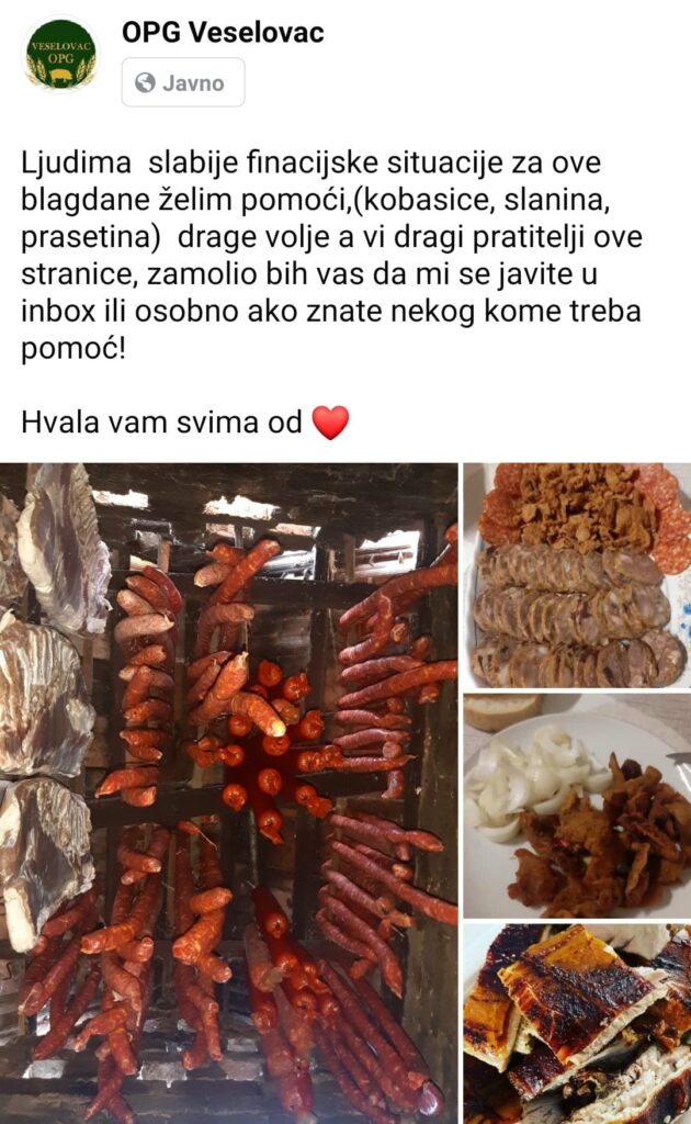 – Ljudima slabije financijske situacije za ove blagdane želim pomoći drage volje. Kobasice, slanina, prasetina… A Vi dragi pratitelji ove stranice, zamolio bih Vas da mi se javite u ‘inbox’ ili osobno, ako znate nekog kome treba pomoć – napisali su na Facebooku iz OPG-a Veselovac iz Donjeg Miholjca.