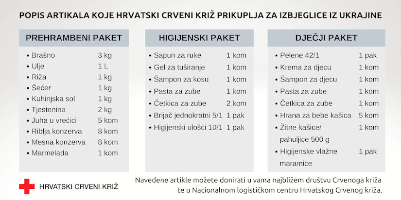 Popis artikala rezultat je dogovora s Crvenim križevima iz Ukrajine i okolnih zemalja. Naime, tim Hrvatskog Crvenog križa koji je protekli vikend boravio u Ukrajini, provjerio je stanje izravno na terenu kako bi se uvjerio što je točno potrebno ljudima izbjeglima iz Ukrajine, kao i najbolji način za dostavu pomoći. U skladu s tim, ali i iskustvom rada s izbjeglicama koje su zaštitu potražile u Hrvatskoj, kreiran je popis potrebnih proizvoda i Hrvatski Crveni križ trenutno neće biti u mogućnosti prikupljati ništa osim navedenoga – navodi se.