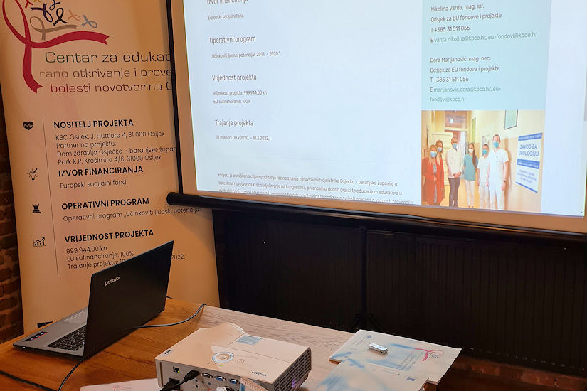 U ponedjeljak, 16. svibnja 2022. godine, održana je hibridna konferencija povodom završetka projekta pod nazivom “Centar za edukacije, rano otkrivanje i prevenciju bolesti novotvorina Osječko-baranjske županije” čiji je nositelj KBC Osijek, a partner na projektu Dom zdravlja Osječko-baranjske županije. Vrijednost projekta je 999.944 kune i u cijelosti je financiran sredstvima EU-a iz Europskog socijalnog fonda kroz Operativni program „Učinkoviti ljudski potencijali“, a provodio se u trajanju od 18 mjeseci (10.9.2020. – 28.5.2022.). Projekt je osmišljen s ciljem podizanja razine znanja zdravstvenih djelatnika OBŽ o bolestima novotvorina kroz sudjelovanje na kongresima, prijenosima dobrih praksi te edukacijom edukatora u svrhu liječenja, ranog otkrivanja i prevencije bolesti novotvorina te podizanje svijesti građana o važnosti prevencije bolesti i promocije zdravlja na području OBŽ i šire.