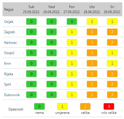 – Istraživanje povezanosti između temperature zraka i smrtnosti, omogućilo je određivanje kritične temperature zraka za različite dijelove Hrvatske iznad koje se pojavljuje povećana opasnost od smrti, koja je potencirana u slučajevima kada ekstremna temperatura traje dulje vrijeme. Radi zaštite građana, uveden je sustav upozoravanja na opasnost od vrućine, koje se provodi u razdoblju od 15. svibnja do 15. rujna. Na temelju prognoze temperature zraka za danas i sljedeća četiri dana, DHMZ objavljuje upozorenja na opasnost od vrućine na sljedeće četiri razine: nema opasnosti, umjerena opasnost, velika opasnost i vrlo velika opasnost – dodaju.
