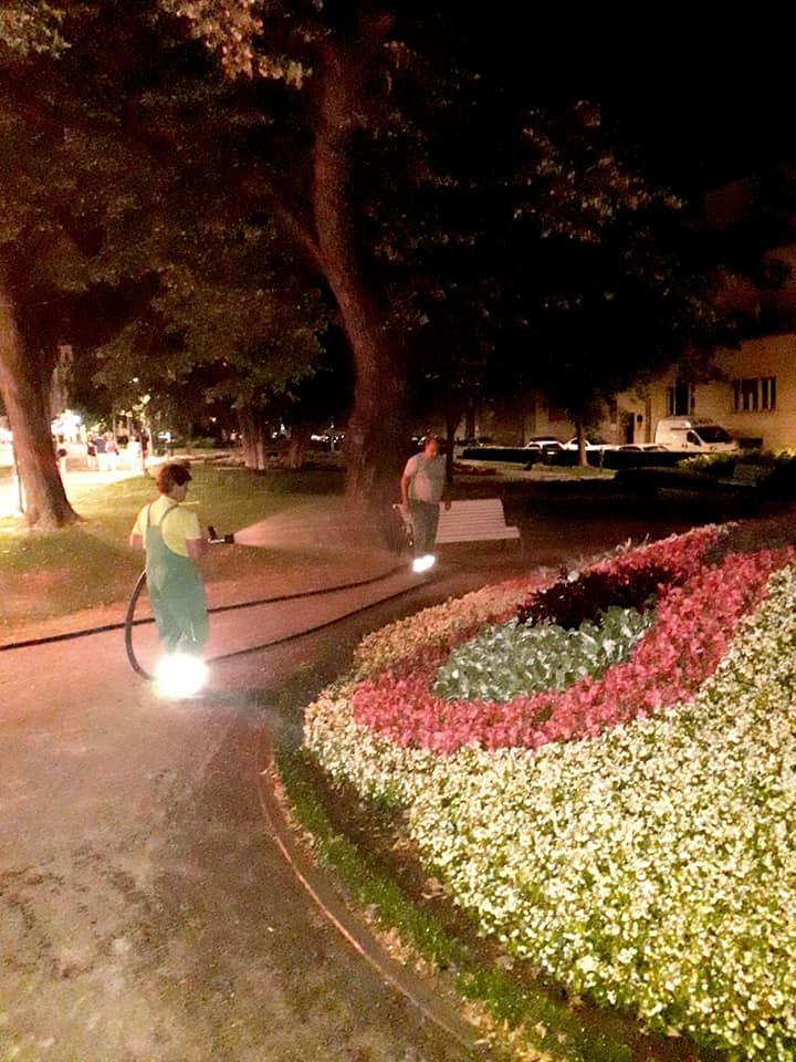 Danas se očekuju 34 stupnja, sutra, u četvrtak i 36. Do subote će biti i 40 stupnjeva. Da se ne bi Sakuntala park, odnosno bilo koji drugi park u Osijeku, pretvorio u ‘spaljenu zemlju’, Unikom je u noćnim satima počeo nalijevati cvjetne i travnate površine…