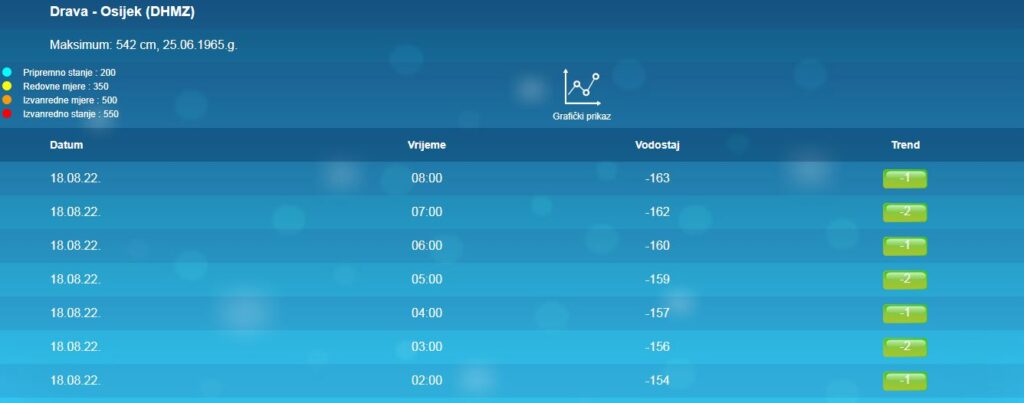 ‘Strmoglavio’ se vodostaj Drave kod Osijeka jučer od 15 sati. Svakoga sata neprestano pada za centimetar ili više. U zadnja 24 sata vodostaj je pao za oko 20 centimetara i sada je, u 9 sati, što je zadnja mjerena vrijednost za pisanja ovog teksta, -164 centimetra.