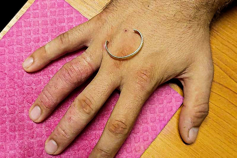 Sada pod prst, između prsta i prstena, podmjeste ‘špijune za ventile’, a onda bez straha režu preciznom burisilicom dok ne raspolove prsten.