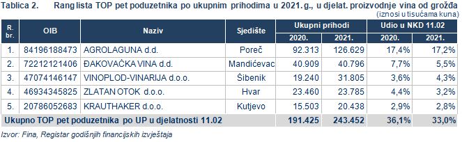 – Promatrana skupina poduzetnika ostvarila je 737,8 milijuna kuna ukupnih prihoda, 724,2 milijuna kuna ukupnih rashoda, dobit razdoblja od 59,8 milijuna kuna, gubitak razdoblja od 51,1 milijun kuna te su iskazali pozitivan konsolidirani financijski rezultat u iznosu od 8,7 milijuna kuna, u odnosu na 51,7 milijuna kuna neto gubitka u 2020. godini. Zabilježeno je povećanje ukupnih prihoda za 39%, ukupnih rashoda za 24,8%, dobiti razdoblja za 172,5% te smanjenje gubitka razdoblja za 30,6%. Od ukupnog broja poduzetnika u djelatnosti proizvodnje vina od grožđa, 62,5% poduzetnika poslovalo je s dobiti, dok je 37,5% iskazalo gubitak razdoblja.