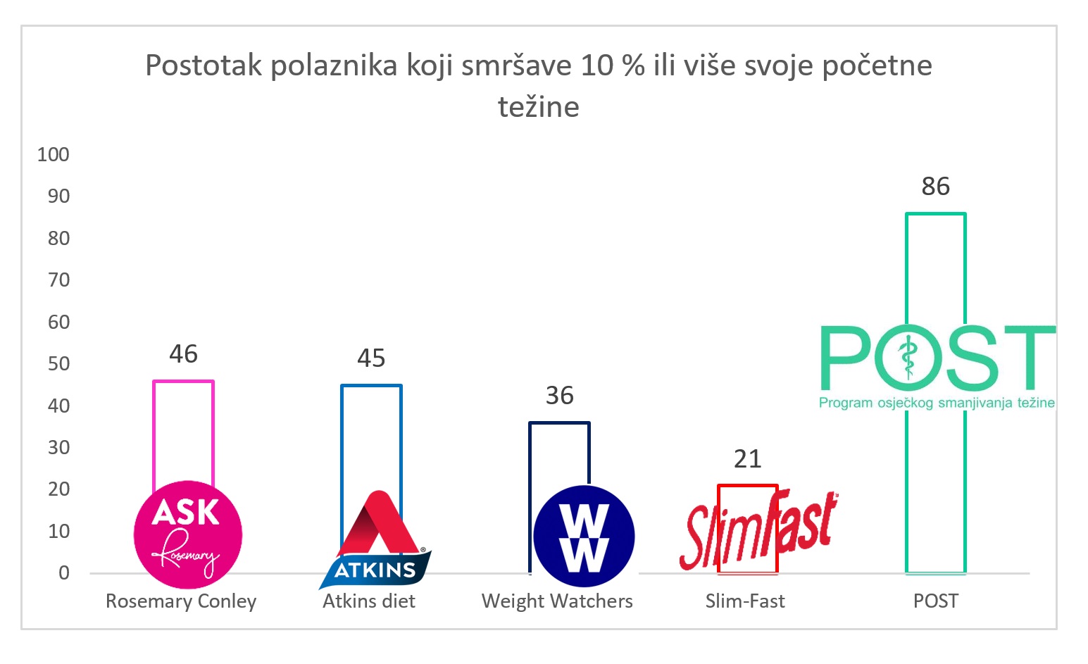 – Prošli je tečaj (Program traje 5 mjeseci) završio 51 polaznik smršavjevši ukupno 804 kg, tj. prosječno 15,8 kg, odnosno 14,7 % početne težine. Osobito je važan i dojmljiv podatak da su svi polaznici smršavjeli više od 5 %, a više od 10 % početne težine smršavjelo je 86,3 % polaznika što POST pretvara u daleko najučinkovitiji svjetski program mršavljenja. Naime, najpoznatiji svjetski programi mršavljenja imaju znatno manji postotak osoba koje smršave 10 ili više posto svoje težine. Tako tijekom 6 mjeseci (POST traje pet mjeseci) u programu Rosemary Conley 10 % svoje težine smršavi 46 % polaznika, u Atkins diet 45 %, Weight Watchers 36 % i u programu Slim-Fast 21 % polaznika. (Slika 1)
