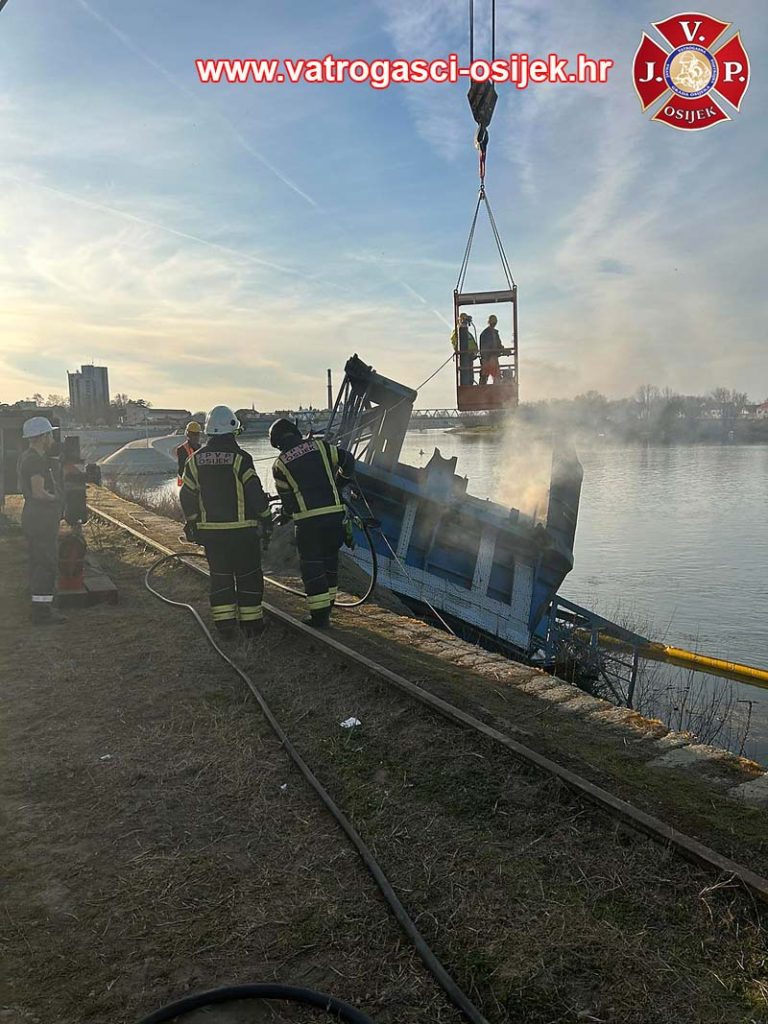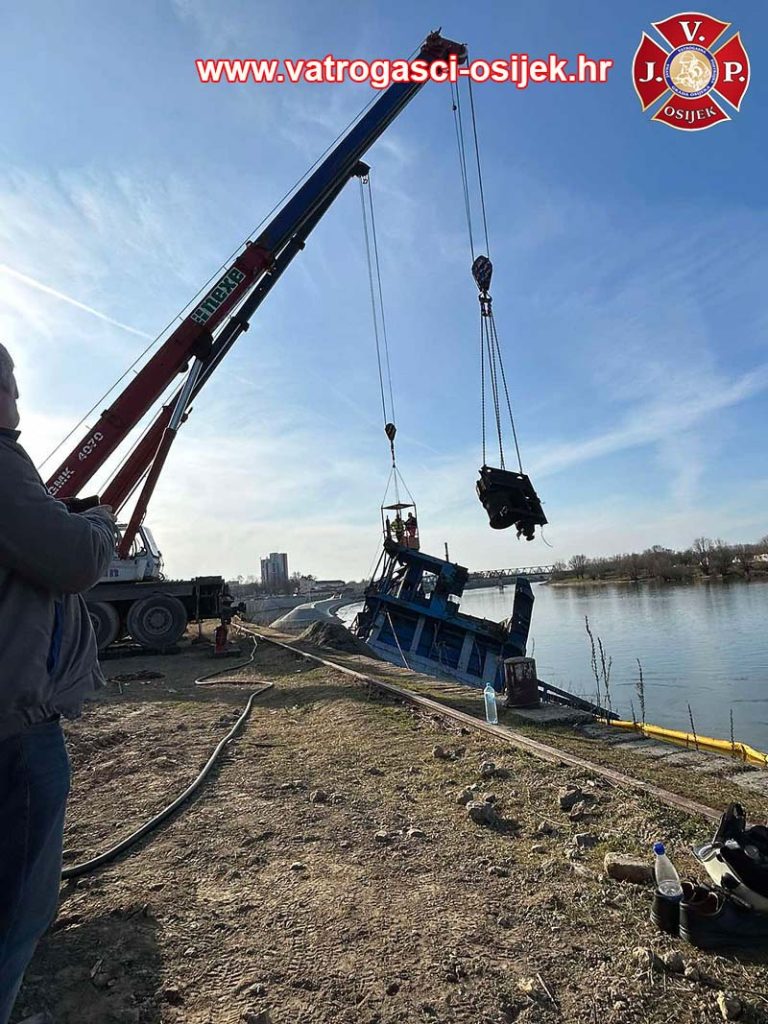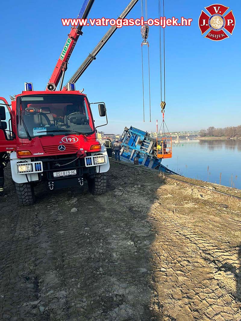 Posao je, razvidno je iz objavljenih fotografija JVP Osijek, nastavljen, a ovoga puta uz osječke vatrogasce. Jer, dizalicu sada treba izvući s obale i iz korita rijeke, a njezino podnožje ostaje kao ‘spomenik’ u Osijeku, na nekadašnju lučku prošlost u tom dijelu stare luke Tranzit.