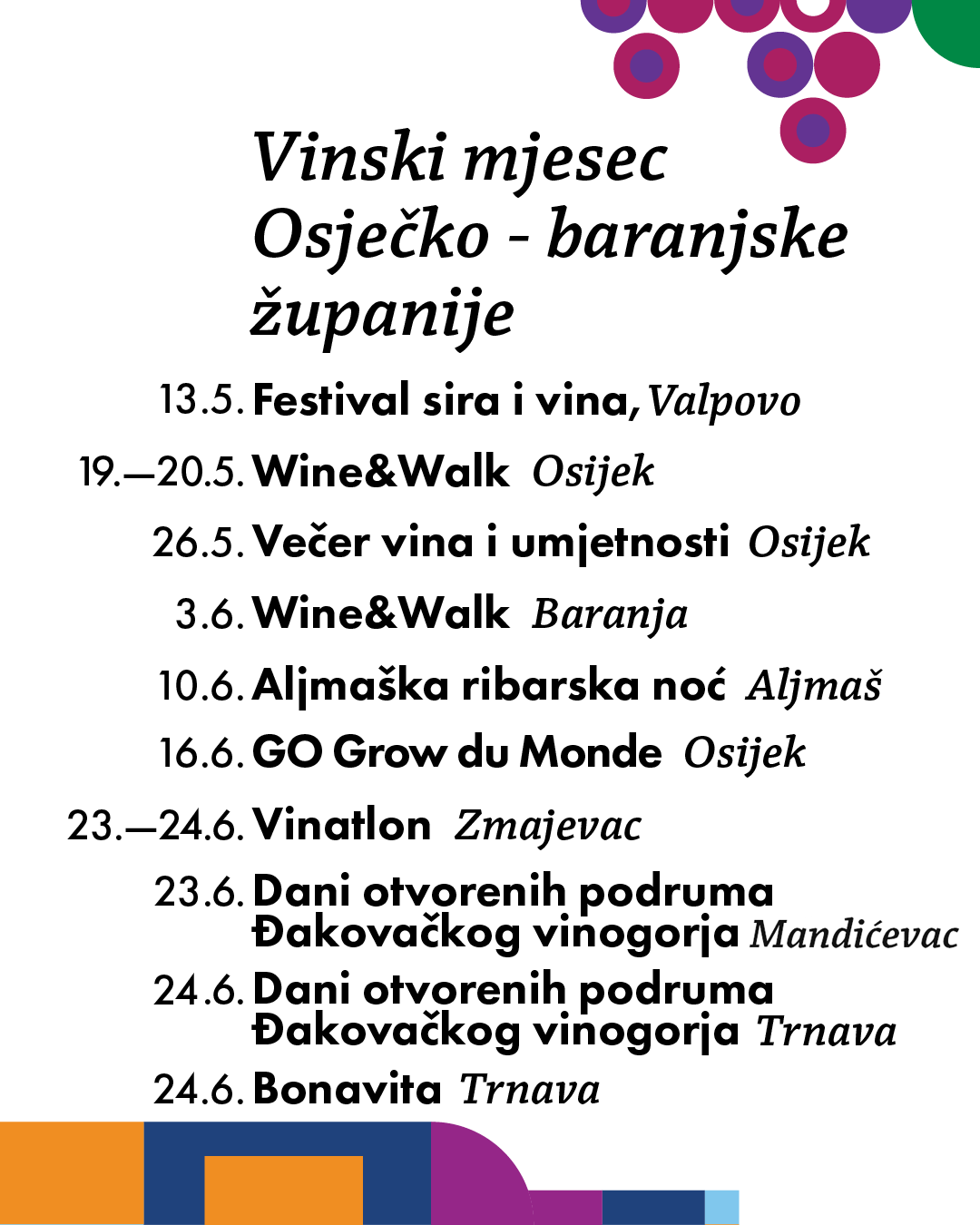 – Sve započinje 13.5. Festivalom sira i vina u Valpovu, a zatim se uz vino družimo u Osijeku na Wine & Walku 19. i 20.5., te na Večeri vina i umjetnosti 26.5. Početkom lipnja idemo u baranjsko vinogorje gdje nas 3.6. čeka sedmo izdanje Baranja Wine & Walk. Koje vino najbolje paše uz dunavsku ribu otkrijte 10.6. u erdutskom vinogorju na Aljmaškoj ribarskoj noći. Ranije istoga dana, zavirite u Bure kulture 10.6. na vidikovcu usred bujnih i pitoresknihvinograda vinarije Belje.