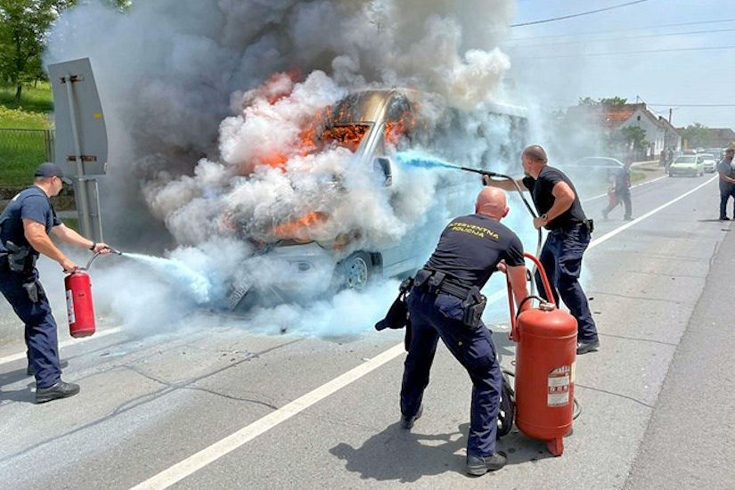Nema oklijevanja: Interventna policija gasila požar ‘mini busa’ do dolaska vatrogasaca!