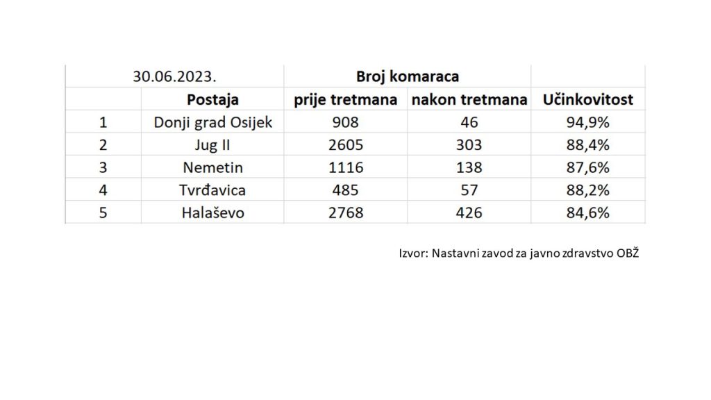 Na temelju preporuke Nastavnog zavoda za javno zdravstvo Osječko-baranjske županije, u petak, 30. lipnja, odrađena su dva adulticidna tretmana sa zemlje u Josipovcu i Višnjevcu te dijelu obližnjeg zelenog pojasa, kao i u dijelovima zelenog i naseljenog područja u Podravlju.