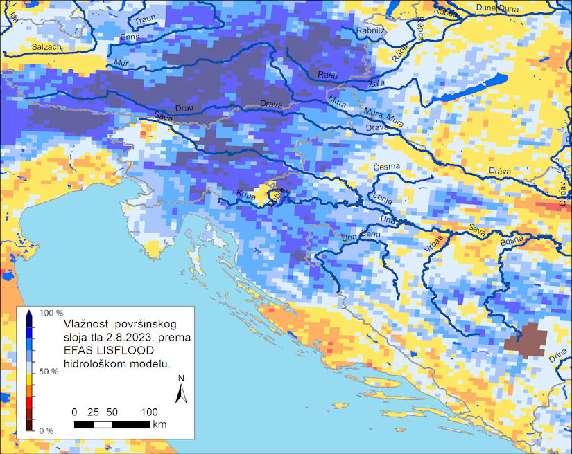 Nestabilno i oborinama bogato razdoblje na području Austrije, Slovenije, zapadne, središnje i sjeverne Hrvatske tj. na slivovima Mure, Drave i Save traje već neko vrijeme. Zbog toga su ta područja visoko zasićena vodom što nam pokazuju plave nijanse na karti vlažnosti tla od 2. kolovoza 2023.
