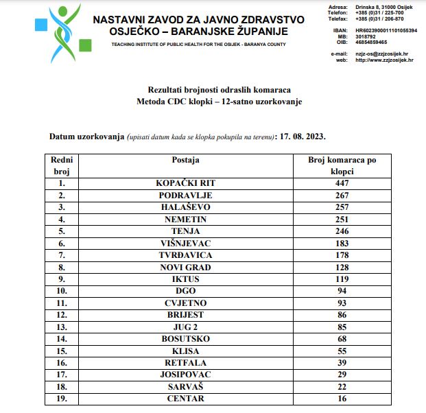 Zavod je objavio danas i podatke o brojnosti komaraca u Osijeku i okolici, a na temelju uzorkovanja klopkama. Proveden je monitoring CDC klopkama u razdoblju od 12 sati.