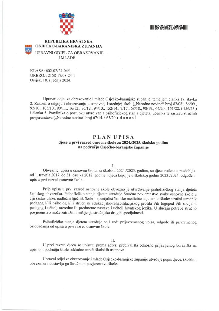 – Upravni odjel za obrazovanje i mlade Osječko-baranjske županije donio je 18. siječnja 2024. godine Plan upisa djece u prvi razred osnovne škole za 2024./2025. školsku godinu na području Osječko-baranjske županije – objavila je Osječko-baranjska županija, dodajući…