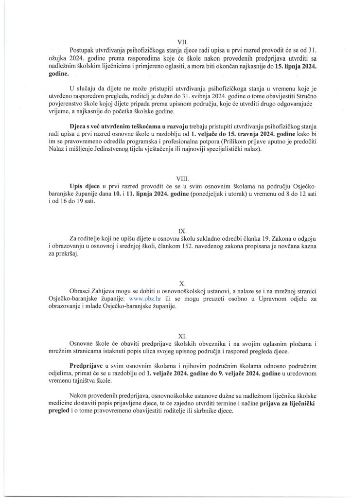 – Upisi djece u prvi razred provodit će se u svim osnovnim školama na području Osječko-baranjske županije 10. i 11. lipnja 2024. godine u vremenu od 8.00 do 12.00 sati te od 16.00 do 19.00 sati – zaključuje se, a niže možete pogledati ‘pravila igre’…