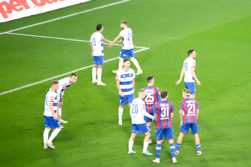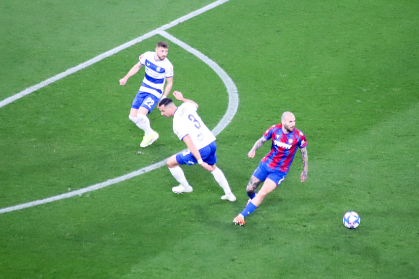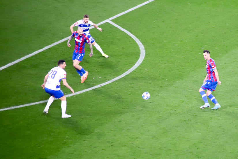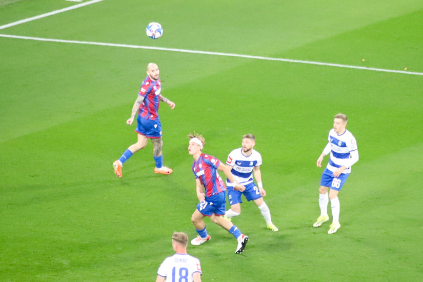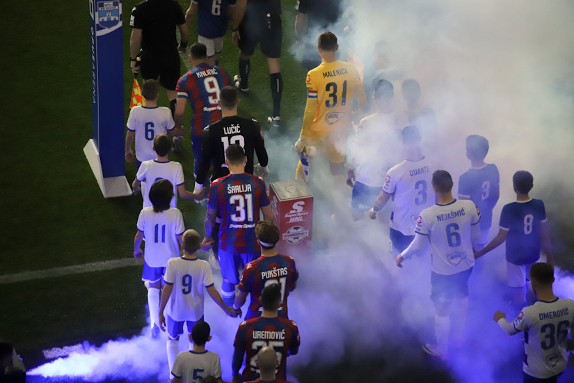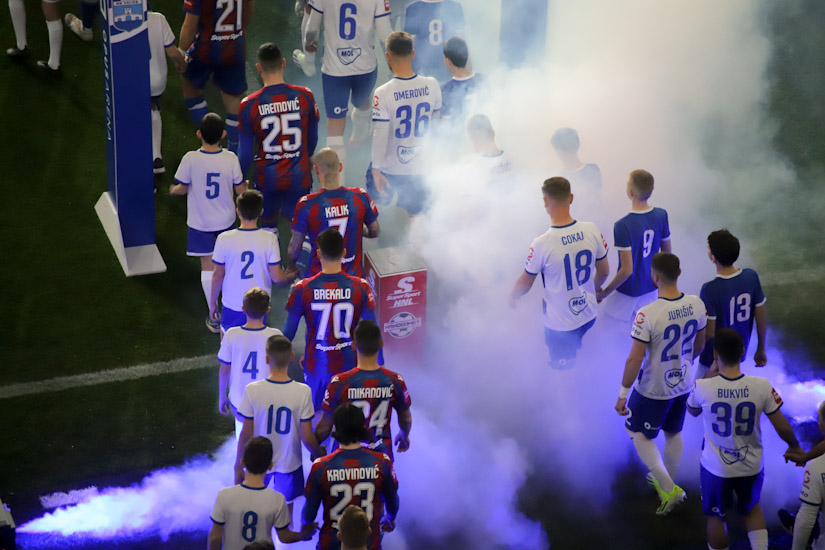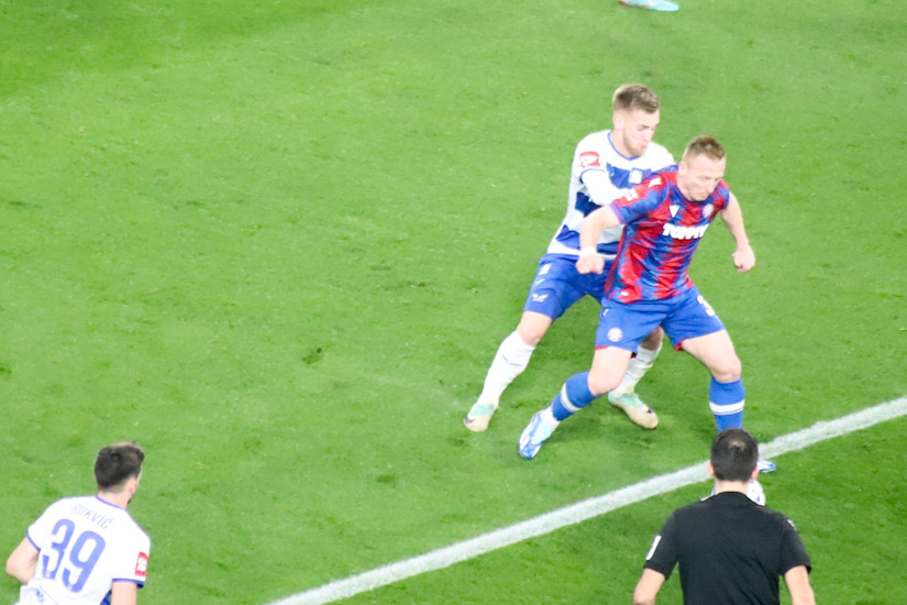 Označiti bilo koju stranu derbija kao opasniju, barem u prvih 30-ak minuta, bilo bi neutemeljeno. Igralo se o sredini terena, ali nimalo jalovo, nimalo ‘hnl-ovski’, već kao kada se ‘dva ovna sudare na brvnu’ pa krene trdoglavo nadmetanje do prve tuđe greške. Bilo je tu oštrih pokušaja da se probiju disciplinirano ‘utegnute’ linije, bilo je ‘muških duela’, ‘opasnih ideja’, ali napadači jedva da su igrali u tom razdoblju, vratari bili beskorisni. Pa ipak, bez obzira na te pohvale o čvrstoj ‘šahovskoj partiji’, istina je i da je nastavak takve utakmice sugerirao vrlo izvjestan razvoj – dosade.