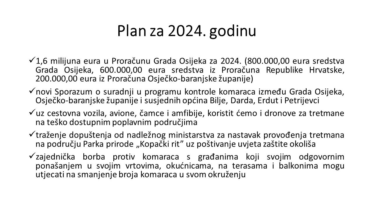 Kreće! Za borbu protiv komaraca ove godine je predviđeno najviše do sada – 1,9 milijuna eura. Nastavlja se i lanjski model suradnje s Osječko-baranjskom županijom i okolnim općinama. Grad Osijek krenuo je ‘s prvim zrakama’ sunca u obračun s komarcima u ’24. godini. Zamjenik gradonačelnika Osijeka Dragan Vulin danas je predstavio plan djelovanja, a u koji su uključeni NZJZ OBŽ, OBŽ, Darda, Bilje, Petrijevaci i Erdut. Naime ‘debelo’ iznad 90% komaraca dolazi iz drugih općina u Osijek i Grad je morao reagirati, pomoćni okolnim općinama u suzbijanju komaraca, a kako bi ih pravovremeno zaustavio, ‘na izvoru’. Taj model je, govori Vulin, omogućio učinkovitost prošlogodišnjih tretmana komaraca veću od 80 posto.