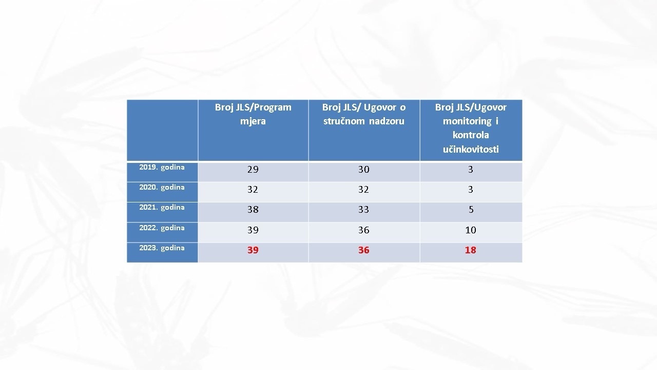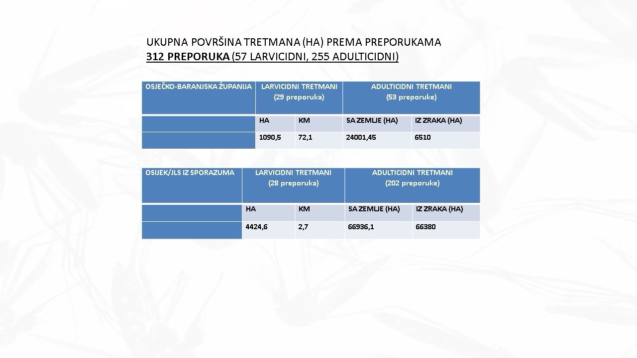 U proračunu Osijeka osigurano je 800.000 eura, lobiranjem gradonačelnika iz države dolazi 600.000 eura, Osječko-baranjska županija sudjeluje s 200.000 eura, dok su ostatak do rekordnog iznosa od 1,9 milijuna eura osigurale okolne općine. Nadalje, Vulin je izvijestio kako je u tijeku natječaj za odabir izvođača radova, koji će biti završen 19. travnja. – Za razliku od prošle godine, u provedbi larvicidnih tretmana osim cestovnih vozila, aviona, čamaca i amfibija koristit ćemo i dronove, posebice na teško dostupnim poplavnim područjima – najavio je Vulin, izražavajući nadu da će godina biti lakša nego prethodna, u kojoj je Osijek imao dva visoka vodostaja, aktivaciju starih legla, koje se nije ni moglo bez vode larvicidno tretirati, što čini ‘začarani krug’.
