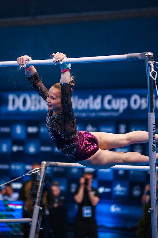U premijernom nastupu u Osijeku najmlađa članica naše reprezentacije, 15-godišnja Riječanka Sofia Mešter bila je 7. na dvovisinskim ručama sa 11.900 (5.0).