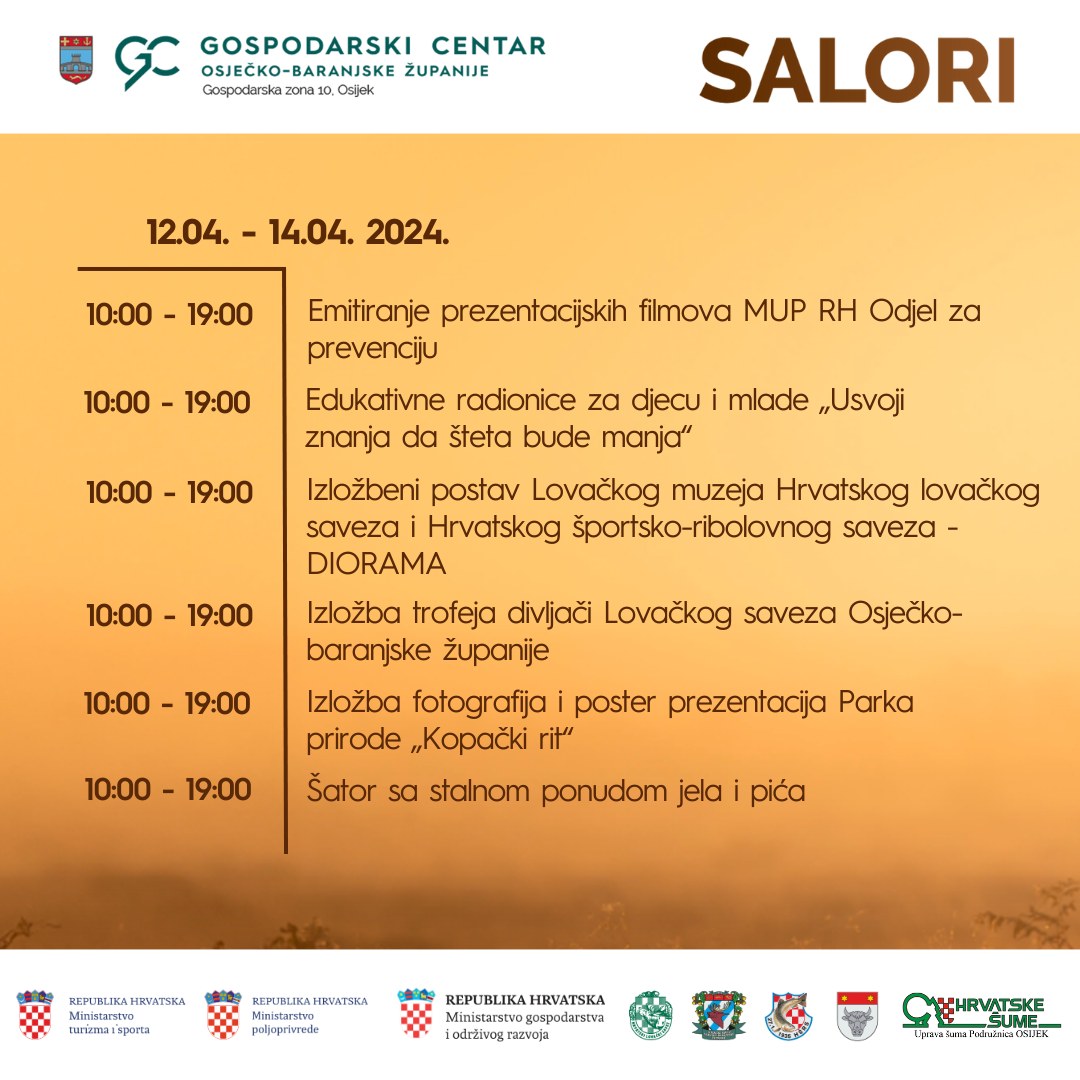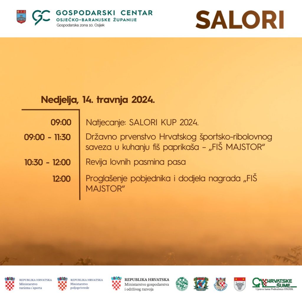Poslije proljetnog sajma u Gospodarskom centru u Osijeku, pred nama je vrlo skoro još jedan veliki događaj i sajam u istom prostoru. Stiže za koji dan Sajam lova, ribolova i turizma. Naime, 19. SALORI, sajam lova, ribolova i turizma održat će se od 12. do 14. travnja 2024. u Gospodarskom centru, a iz organizacije se polako doznaje kakvi će sadržaji biti na dispoziciji u vrhunskom prostoru u Osijeku…