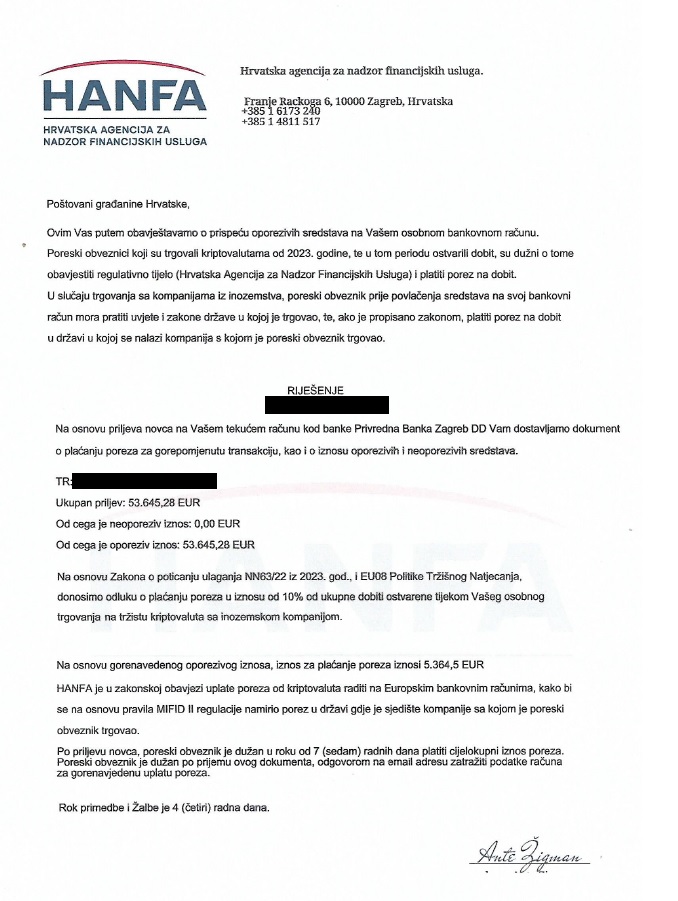 – U takvoj se situaciji našla građanka koja je uputila pritužbu Hanfi. Ona je dobila dopis na fiktivnom memorandumu Hanfe s potpisom predsjednika Upravnog vijeća, u kojem ju se obavještava o tzv. dospijeću oporezivih sredstava na njezin osobni bankovni račun te se od nje traži uplata poreza kako bi mogla povući ta sredstva. U dopisu se navodi IBAN njezina računa u banci u Hrvatskoj, opisuju se različite regulative na osnovi kojih bi trebala uplatiti porez u iznosu od 10 % od ukupne dobiti ostvarene tijekom trgovanja na tržištu kriptovaluta s inozemnim društvom te se poziva da pošalje e-mail kako bi dobila podatke banke za uplatu spomenutog iznosa poreza. Nakon odgovora na dopis dobila je upute oko uplate poreza u banci sa sjedištem u Poljskoj, kojoj je spomenuti iznos nažalost i uplatila.