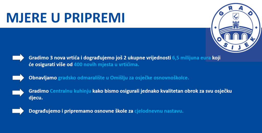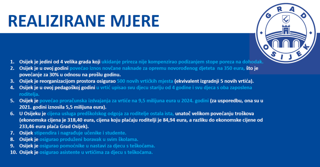 Osijek je do sada, kao demografske mjere, ne podizanjem poreza uvjetovao rast plaća smanjenjem prireza, povećan je novčani iznos za novorođeno dijete, na 350 eura, reorganizacijom prostora Grad je osigurao više od 500 novih mjesta u vrtićima, broj odgojiteljica je rastao za skoro 100, upisana su sva djeca s oba roditelja, povećana su proračunska izdvajanja za vrtiće, do 9,5 milijuna eura, a rasti će iznad 11 milijuna. Nadalje, Osijek je zadržao cijenu vrtića, ostala je na 80-ak eura, iako bi trebala tržišno biti iznad 300 eura. Osijek stipendira učenike i studente, postoje asistenti u vrtićima i školama…, a slijedi izgradnja novih i nadogradnja postojećih vrtića, za još 240 djece. Obnavlja se i odmaralište u Omišlju, ua djecu, od sljedeće godine. A kada ondje ne budu djeca, bit će umirovljenici. Gradi se i centralna kuhinja za svu djecu…