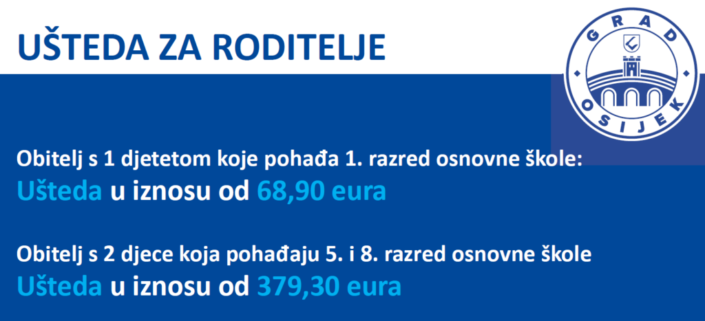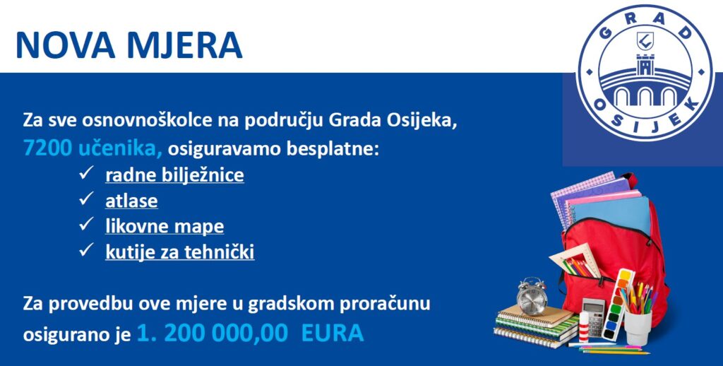 Udžbenike za osnovnu školu djeca diljem zemlje, tako i u Osijeku, dobiju na stolu prvog dana školske godine. Iako je riječ o velikoj pomoći, tu priča o izdacima ne završava, ni blizu. Taj ‘paket’ ne uključuje radne zadatke, zbirke…, ne uključuje sve ispisane i korištene sastavnice školske torbe svakog učenika, a ti troškovi, ovisno od razreda do razreda, mogu dostići naposljetku i oko 200, 300 eura. Razumijevanja radi pojedinima, dodatni trošak je i oko 1.500, 2.000 nekadašnjih kuna. Grad Osijek, poslije svih napora za upisom sve djece u vrtiće, poslije početka gradnje i dogradnje vrtića, nakon početka brojnih radova na energetskoj obnovi škola, pripremi istih za jednosmjensku nastavu, poslije svih stipendiranja i vođenja računa o svojoj djeci, rebalansom proračuna donosi nevjerojatan potez. Grad Osijek i prije svega gradonačelnik Osijeka Ivan Radić, odlučili je svoj djeci osnovnih škola Osijeka kupiti sve što im je još potrebno za nastavu, izvan ‘paketa udžbenika’. Time postaju prvi grad u Hrvatskoj koji je osigurao uistinu besplatno školovanje.
