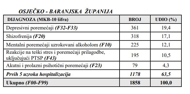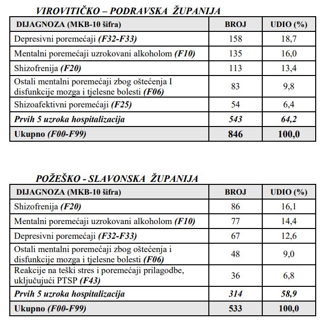 – Analiza bolničkog pobola prema županijama prebivališta za 2022. godinu, pokazuje da su mentalni poremećaji sudjelovali u ukupnom broju hospitalizacija u županijama s udjelima od 3,2 % (Varaždinska županija) do 6,6% (Virovitičko-podravska županija) – navodi HZJZ, kao i podatke za svaku županiju, odnosno u kojim su bolnicama završavali pacijenti…