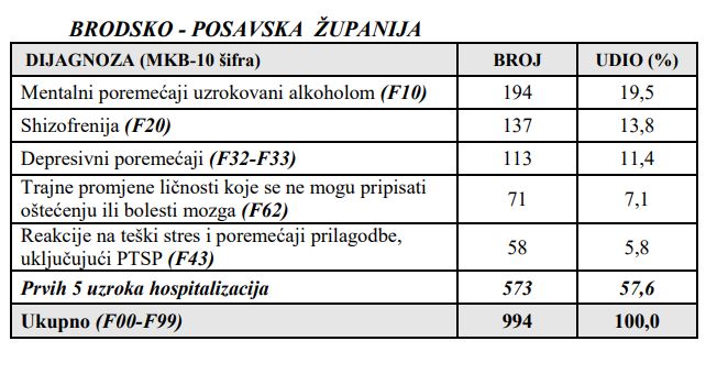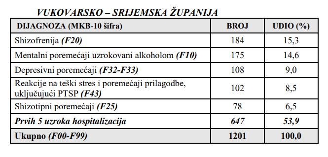 U dobi do 9 godina bilo je dva puta više hospitalizacija dječaka nego djevojčica. Najčešći razlozi hospitalizacija bili su zbog pervazivnih razvojnih poremećaja, specifičnih poremećaja razvoja govora i jezika, ostalih poremećaja psihološkog razvoja…, navodi Zavod, dodajući kako je u dobi 10-19 godina bilo je dva puta više hospitalizacija djevojčica, a najčešći razlozi hospitalizacija bili su emocionalni poremećaji s početkom specifično u djetinjstvu, mješoviti poremećaji ponašanja i osjeta, akutni i prolazni psihotični poremećaji, reakcije na teški stres i poremećaji prilagodbe te poremećaji hranjenja. U dobi 20-39 godina bilo je više hospitalizacija muškaraca, a vodeći uzroci hospitalizacija bili su shizofrenija, mentalni poremećaji uzrokovani alkoholom… Isto tako i u dobi 40-59 godina, da bi u dobi 60 i više godina oba spola su bila podjednako hospitalizirana, a najčešći razlozi hospitalizacija bili su ostali mentalni poremećaji zbog oštećenja i disfunkcije mozga i tjelesne bolesti…