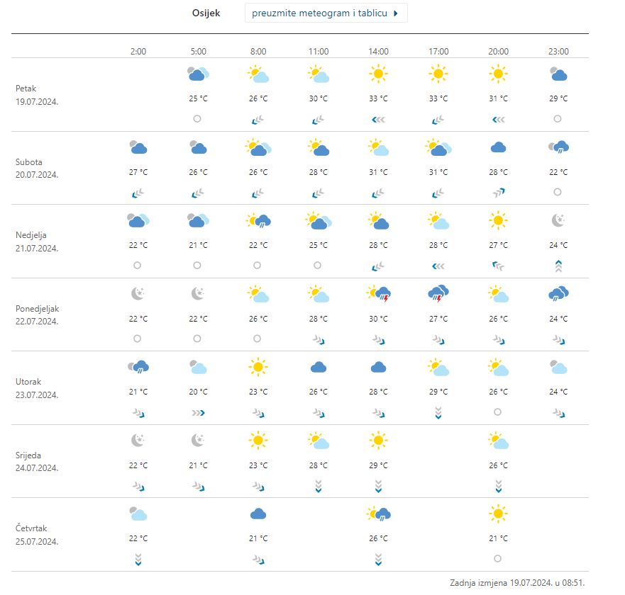 Sutra je na snazi prvi stupanj upozorenja i za nevrijeme i za vrućinu, u nedjelju za sada nikakvih upozorenja nema, a spomenuti 7-dnevni meteogram pokazuje da bi malo više oborina u Osijeku moglo biti u ponedjeljak.