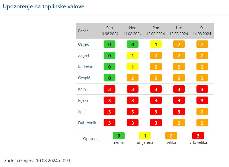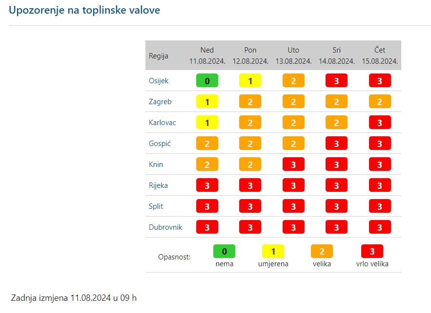 Pisali smo jučer kako su odolijevali Osijek i Slavonija ‘toplinskom valu’, a kojeg je DHMZ najavljivao i bilježio na Jadranu, gdjegod u središnjoj Hrvatskoj, dok je kod nas vrijeme bilo kao ‘iza Gospe’, no otprije dva dana, svakako jučer i danas, DHMZ u svojoj tablici najavljuje ‘toplinski val’ i u našim krajevima, od ponedjeljka, 12. kolovoza. Bit će to prvog dana upozorenje prvog stupnja, ‘žuti alarm’ ili umjerena opasnost, ali već drugog dana, u utorak 13. kolovoza, opasnost raste na ‘narančasti alarm’, na drugi stupanj, a isto se nastavlja i u srijedu, 14. kolovoza.