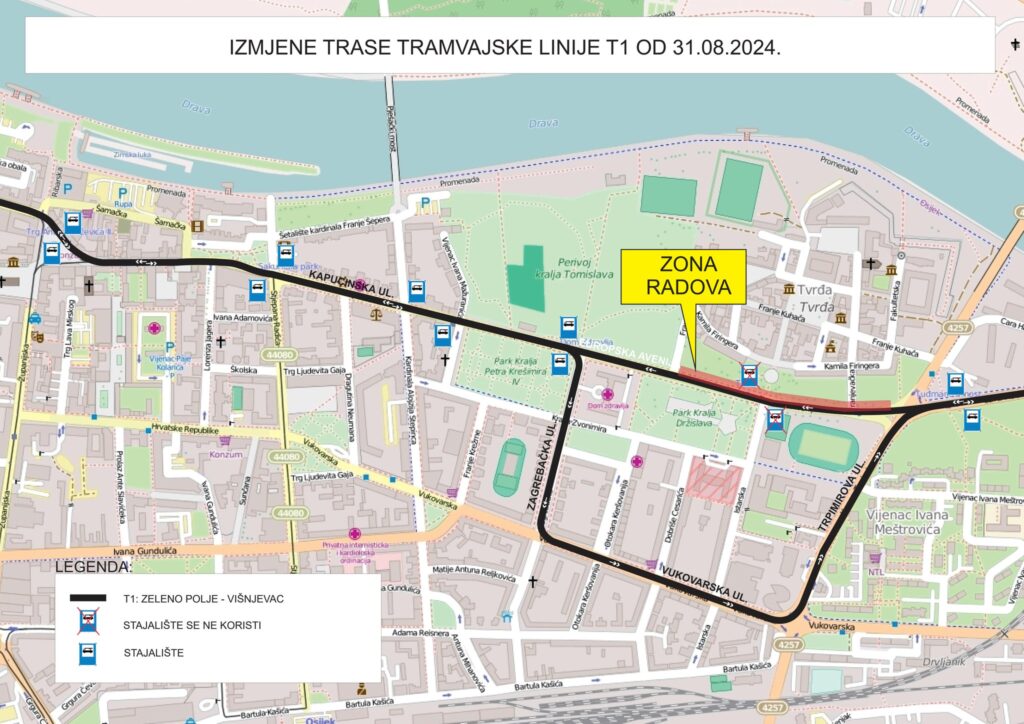 – …iz smjera Zeleno polje – Višnjevac: prometovat će se ustaljenom trasom tramvajske linije T1.
