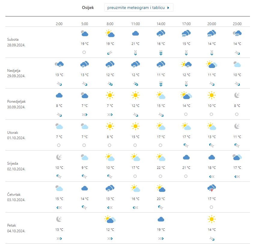 Temperatura u Osijeku u nedjelju pada na 15-ak stupnjeva… – U unutrašnjosti još u noći i rano ujutro pretežno oblačno uz mjestimičnu kišu, osobito na istoku Hrvatske, zatim razvedravanje sa zapada. U unutrašnjosti će puhati umjeren do jak sjeverni i sjeverozapadni vjetar. Najniža temperatura zraka između 9 i 14. Najviša dnevna od 13 do 18 – prognoza je za nedjelju za kopneni dio Hrvatske.