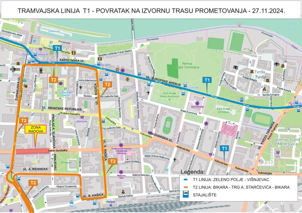 – S tim u svezi, GPP ponovno prometuje cijelom trasom tramvajske linije T1: Zeleno polje – Višnjevac u oba smjera, prema izvornoj ruti: Zeleno polje – Ul. M. Gupca – Ul. cara Hadrijana – Ul. Europske avenije – Kapucinska ulica – trg A. Starčevića – Strossmayerova ulica, sve do Višnjevca. Ista trasa vrijedi i za povratak iz Višnjevca do Zelenog polja – nastavio je GPP, ddoajući…
