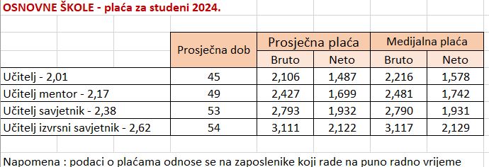 Isplaćene su plaće djelatnicima škola za prosinac, a Ministarstvo znanosti, obrazovanja i mladih objavio je na svojim službenim mrežnim stranicama prosječne i medijalne plaće za mjesec prije, za studeni. Inače, nove plaće isplaćene su na račune 9. siječnja. Uz to, dodaju, vrijedi uzeti i dob djelatnika u obzir, jer prema granskom kolektivnom ugovoru, osnovnu plaću zaposlenika čini umnožak koeficijenta složenosti poslova i osnovice za izračun plaće, uvećan za 0,5 posto za svaku navršenu godinu radnog staža.