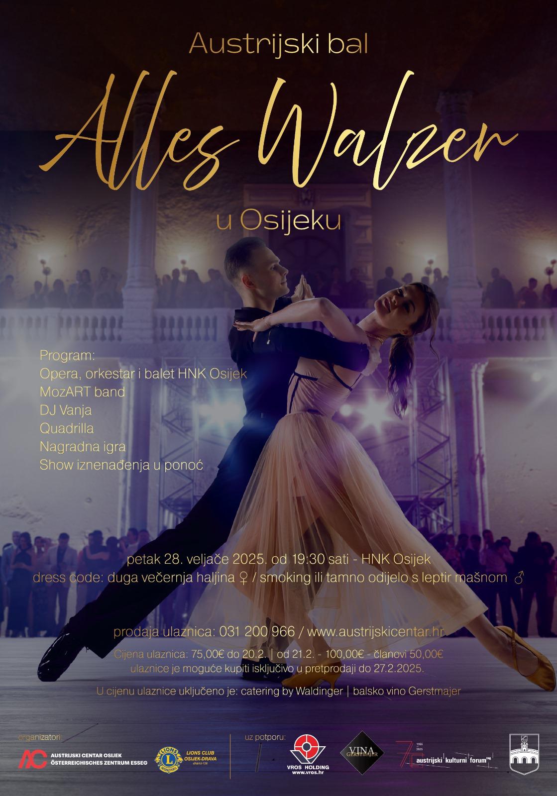 Alles Walzer, kažu i pozivaju! U Osijeku će biti 28. veljače održan Prvi austrijski bal. Organiziraju ga iz Austrijskog centra Osijek. Iako će više informacija o događaju biti otkriveno na skoroj konferenciji za novinstvo, plakat otkriva ponešto detalja ususret ovom ‘eventu’. Prije svega kako će nastupiti operni solisti, orkestar, balet i zbog osječkog HNK-a, uz njih i MozART band, DJ Vanja…, a valja očekivati i ‘quadrillu’, iznenađenje i nagradnu igru.
