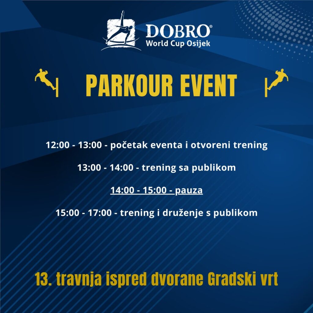 Jedno od glavnih atrakcija na otvorenom bit će dvodnevni Parkour event ispred dvorane Gradski vrt. Posjetitelje očekuju otvoreni treninzi, natjecanja te druženje s profesionalcima ove sve popularnije gimnastičke discipline. Zašto je ova najmlađa gimnastička grana u posljednjih nekoliko godina osvojila svijet, moći ćete provjeriti i sami – u subotu od 12 do 18 sati, a u nedjelju od 12 do 17 sati.