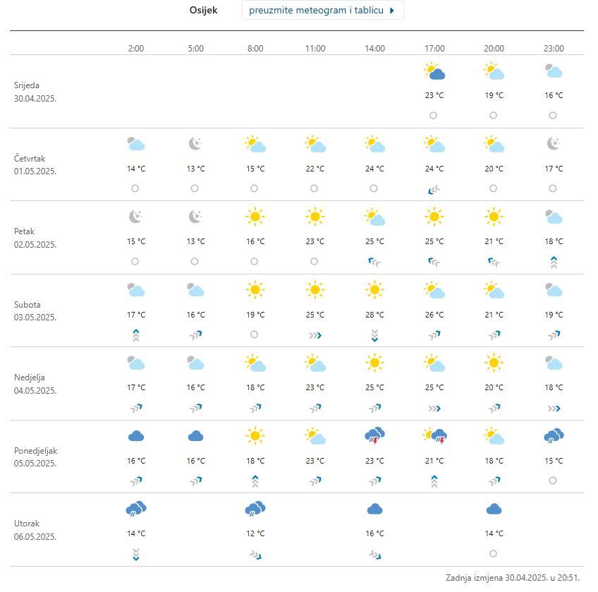 Prognoza vremena sljedećih dana pred nama je ‘čista poezija’. Tu i tamo koji oblak, ‘bonaca’, temperatura skoro pa ljetna. Brojni su Praznik rada ‘spojili’ preko petka s vikendom i otputovali. I dobro će proći. Ali, priroda ovakve lijepe ‘serijale’ u pravilu ‘lomi preko koljena’. A to bi se, kako predviđa sedmodnevni meteogram DHMZ-a, moglo dogoditi baš u ponedjeljak 5. svibnja. Naime, bez da puno ‘filozofiramo’, pogledajte meteogram…